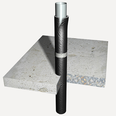 Aislamiento acústico a ruido aéreo de bajante de 90 mm de diámetro, realizado con complejo multicapa, de 4 mm de espesor, 3,6 kg/m² de masa superficial, formado por una membrana de poliolefinas y una lámina viscoelástica de alta densidad; dispuesto en torno a la bajante a modo de coquilla. Incluso cinta viscoelástica autoadhesiva, para sellado de juntas. | ||