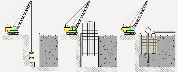 Excavación por paneles según el orden proyectado, con uso de lodos tixotrópicos. Limpieza de la excavación. Colocación de la armadura. Colocación de los encofrados de juntas entre paneles. Colocación del caño Tremie. Colado y compactación del hormigón. Recogida de los lodos tixotrópicos que afloran a medida que se vierte el hormigón y posterior regeneración. Extracción de encofrados de junta. Repetición de las operaciones hasta completar todos los paneles cumpliendo el orden previsto.