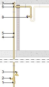 Montante de 12 m de longitud, colocado superficialmente y fijado al paramento, formado por caño de polietileno reticulado (PE-Xa), serie 5, modelo Aqua Pipe "UPONOR IBERIA", de 20 mm de diámetro exterior, PN=6 atm y 1,9 mm de espesor, sistema de unión Quick and Easy, suministrado en rollos; purgador automático de aire de latón y llave de paso de esfera, con maneta vista de acero inoxidable. Incluso material auxiliar para montaje y sujeción a la obra, accesorios y piezas especiales. | ||